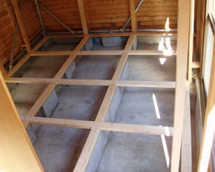| 那須の夏期は頻繁に雷雨が訪れるため、先に屋根と外壁を取り付け、 ある程度、雨が建物の内部に入らない状態にした後に、床下の基礎工事 (コンクリート打ち)を行いました。 |