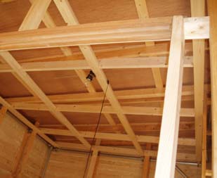 | 揺れに対する負荷を最小限にするため屋根は出来るだけ軽く造り上げ、その後に 外壁を組上げました。外壁は横にした木板を重ね上げ、それらの間はボンドにより 接合しました。また、骨組みとの固定や端面の接合には木ネジを用いました。 外壁に用いた木板は150枚以上で、固定に用いた木ネジは2000本以上になり、 電動ドライバーの衝撃により右手は腱鞘炎になりかけました。 また、木板を重ね上げて固定するために脚立の上り下りを1日当たり数百回も 行ったため膝に支障をきたしました。 |