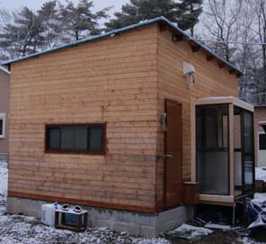 | 外壁同様に内壁も横にした木板(但し、厚さ2cm)を重ね上げて造りました。接合部分等の仕上げ作業を行い、クリスマスには 何とかオーディオをセットすることが出来ました。年内の最後の工事として、掃出窓を2重にすることを兼ねて、雪が降る中、 サンルームを造り上げルことが出来、ほっとしました。 |