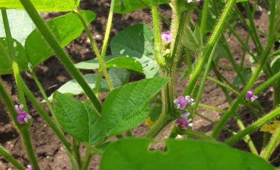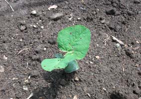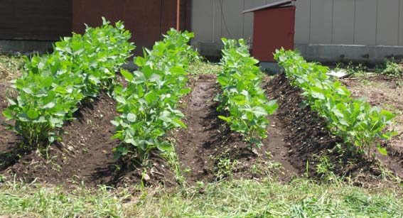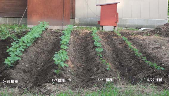 | 今年は秘伝青大豆ではなく、新たな品種の新潟津南産さといらずを初めて蒔きました。さといらずの 最適な開花時期(日長反応性)を調べるため、播種時期を1畝毎、変え、5月28日、6月7日、6月21日、 6月27日に行い、数日後に無事、発芽し、発芽率はほぼ100%でした。 7月初旬には全ての畝に子葉が展開し、7月中旬には畑全体が本葉で覆われる状態になりました。 |